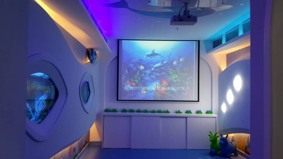 本平臺是綜合了海豚等人類親和動物在不同生理狀態下發出的對人體、尤其是中樞神經系統有協調和促進功能的信號,結合多媒體數字投影、數字調制燈光組成的視聽覺整合訓練系統,輔以現代設計理念的視覺空間結構,讓受訓者“浸潤”于良性視聽感知覺環境中,達到安寧、撫慰、整合及整體狀態提升的功效。