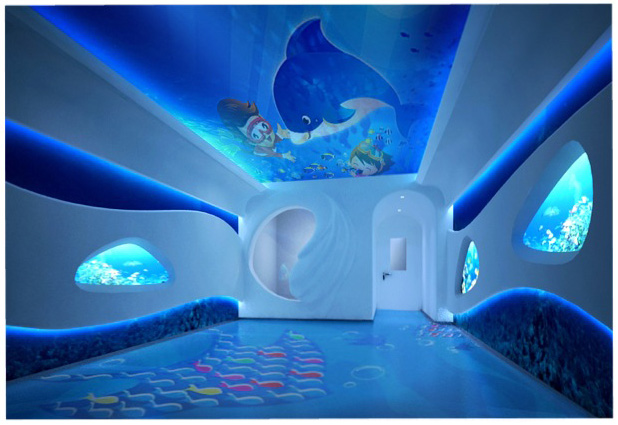 授權設計機構針對本案設計突出“海豚屋”專業整體一站式服務模式,結合海豚仿生學專業訓練設備的聲波作用、燈光作用、環境美學、設計色彩學、生態學及心理學、人體工程學理論等綜合元素設計訓練空間,充分體現專業性、安全性、環保性、美觀性、童趣性及功能性原則。